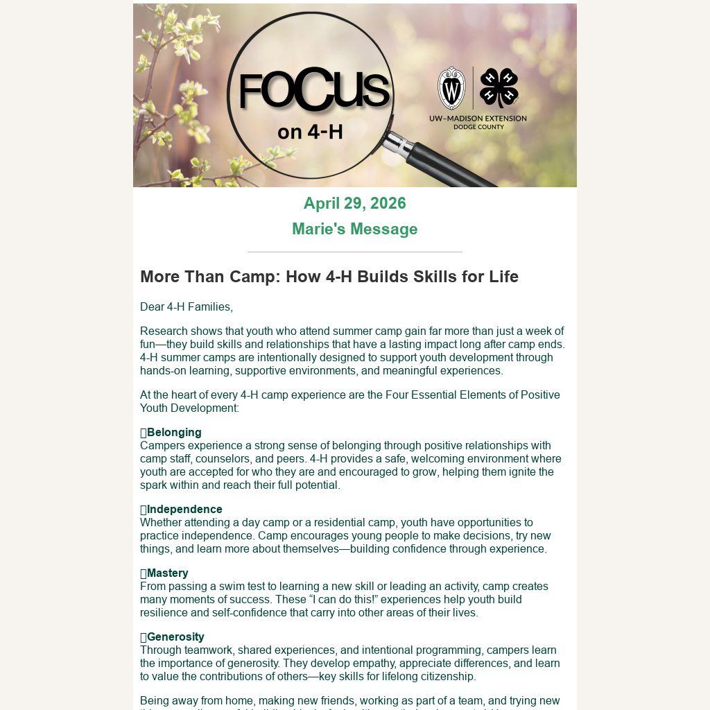 Look for camp links in this weekâs Focus for our own Dodge County 4-H Base Camp: Grades 3â7