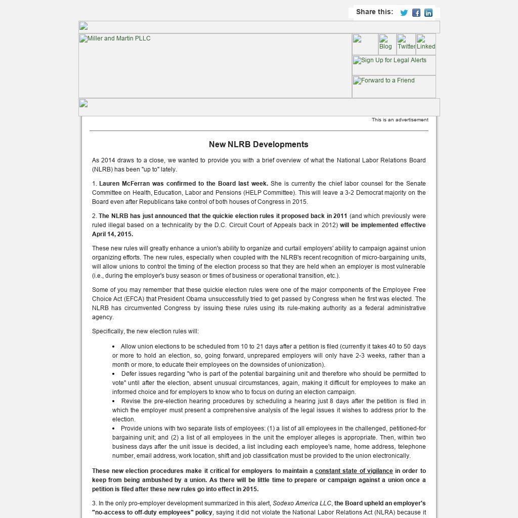 2. The NLRB has just announced that the quickie election rules it proposed back in 2011 (and which previously were ruled illegal based on a technicality by the D.C. Circuit Court of Appeals back in 2012) will be implemented effective April 14, 2015.
