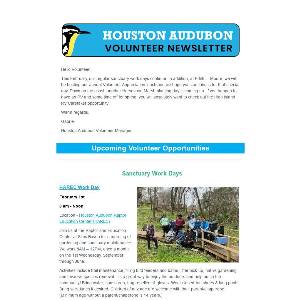 Thank you for being a Houston Audubon volunteer. We hope to see you at one of our events or sanctuaries soon!
