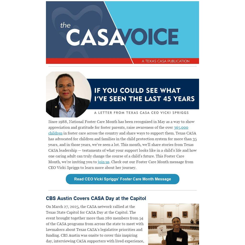 Since 1988, National Foster Care Month has been recognized in May as a way to show appreciation and gratitude for foster parents, raise awareness of the over 365,000 children in foster care across the country and share ways to support them. Texas CASA has advocated for children and families in the child protection system for more than 35 years, and in those years, we’ve seen a lot. This month, we’ll share stories from Texas CASA leadership — testaments of what your support looks like in a child’s life and how one caring adult can truly change the course of a child’s future. This Foster Care Month, we’re inviting you to join us. Check out our Foster Care Month message from CEO Vicki Spriggs to learn more about her journey.