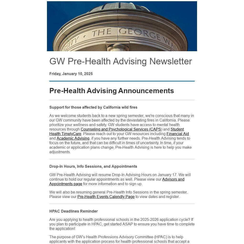 As we welcome students back to a new spring semester, we're conscious that many in our GW community have been affected by the devastating fires in California. Please prioritize your wellness and safety. GW students have access to mental health resources through Counseling and Psychological Services (CAPS) and Student Health TimelyCare. Please reach out to your GW resources including Financial Aid and Academic Advising, if you have any further needs. Pre-Health Advising tends to focus on the future, and that can be difficult in times of uncertainty. In time, if your academic or application plans change, Pre-Health Advising is here to help you make adjustments.