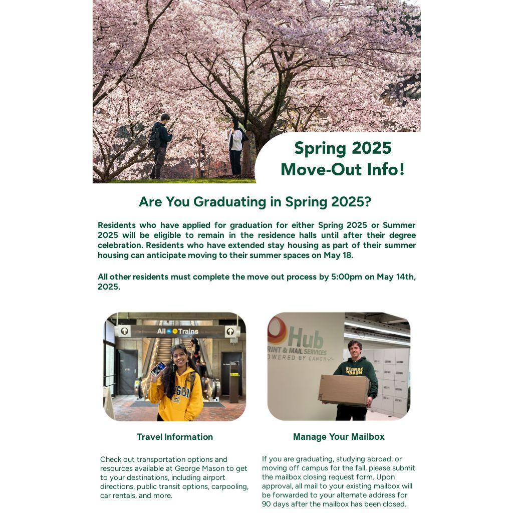 Residents who have applied for graduation for either Spring 2025 or Summer 2025 will be eligible to remain in the residence halls until after their degree celebration. Residents who have extended stay housing as part of their summer housing can anticipate moving to their summer spaces on May 18.
