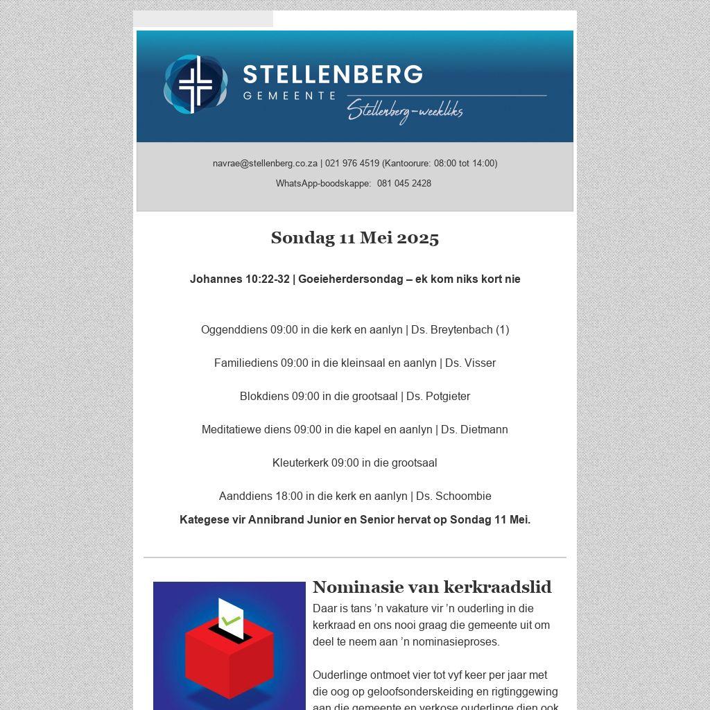 Plaas gerus ’n advertensie in die Stellenberg-weekliks. Die nuusblad word tans weekliks elektronies aan 2 500 persone gestuur en is ook op die gemeente se webwerf beskikbaar. Advertensies sal slegs aanlyn beskikbaar wees en word nie in gedrukte formaat uitgegee nie. Lees meer . . .