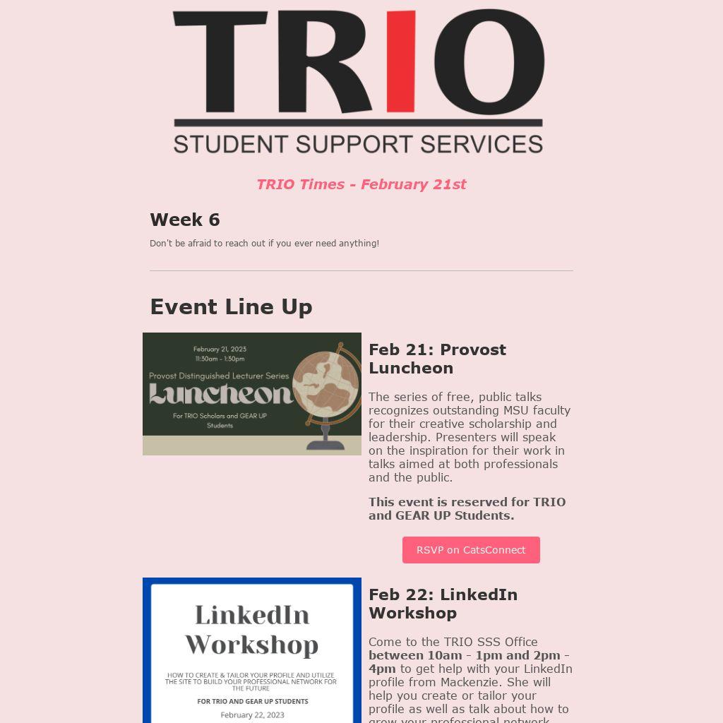 Come to the TRIO SSS Office between 10am - 1pm and 2pm - 4pm to get help with your LinkedIn profile from Mackenzie. She will help you create or tailor your profile as well as talk about how to grow your professional network. More and more employers are utilizing LinkedIn for hiring practices, so start early and be prepared for your future!