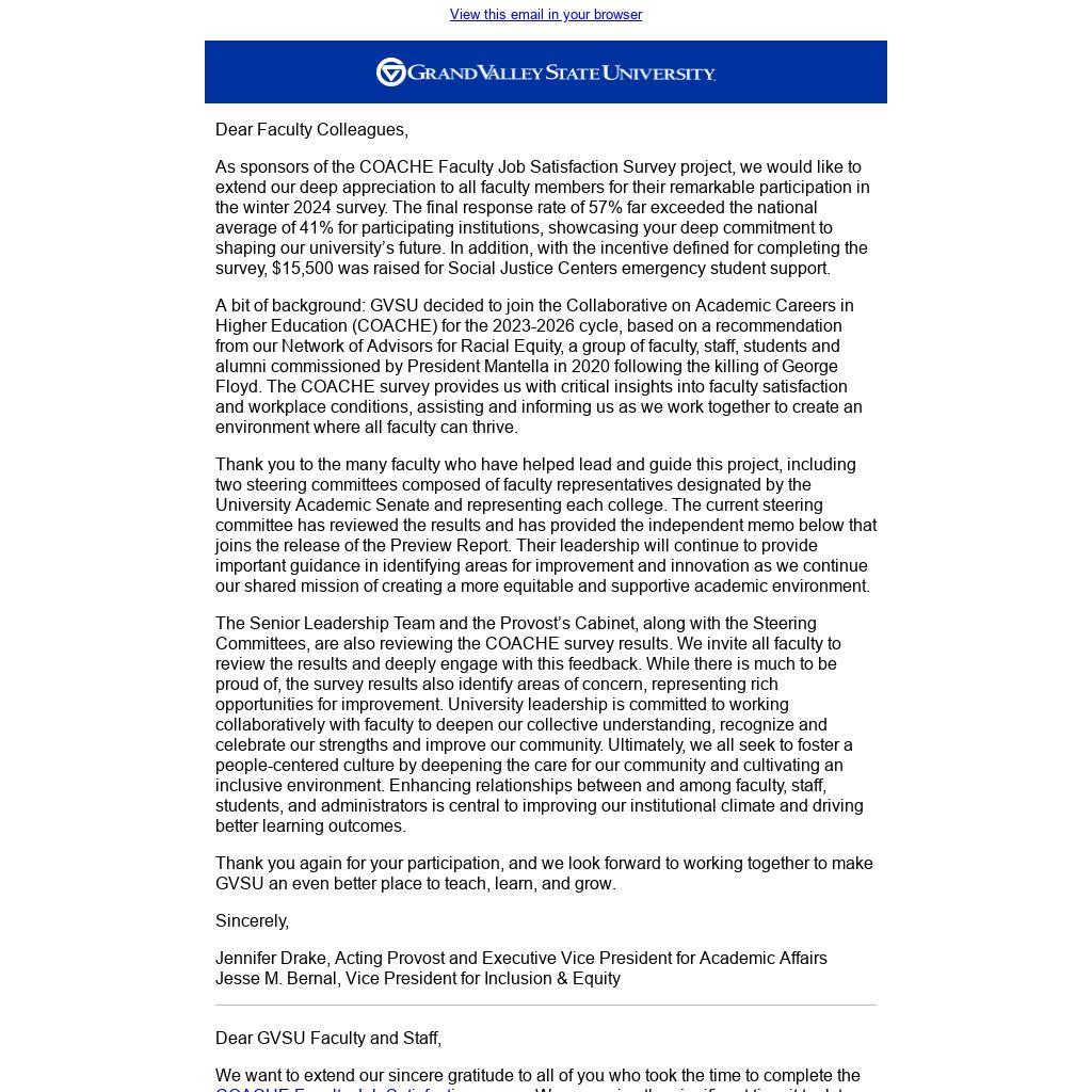 We want to extend our sincere gratitude to all of you who took the time to complete the COACHE Faculty Job Satisfaction survey. We recognize the significant time it took to share this important feedback. Your insights are critical to understanding and improving faculty experiences at Grand Valley. Please find more information about GVSU’s COACHE administration through the Office of the Provost website.