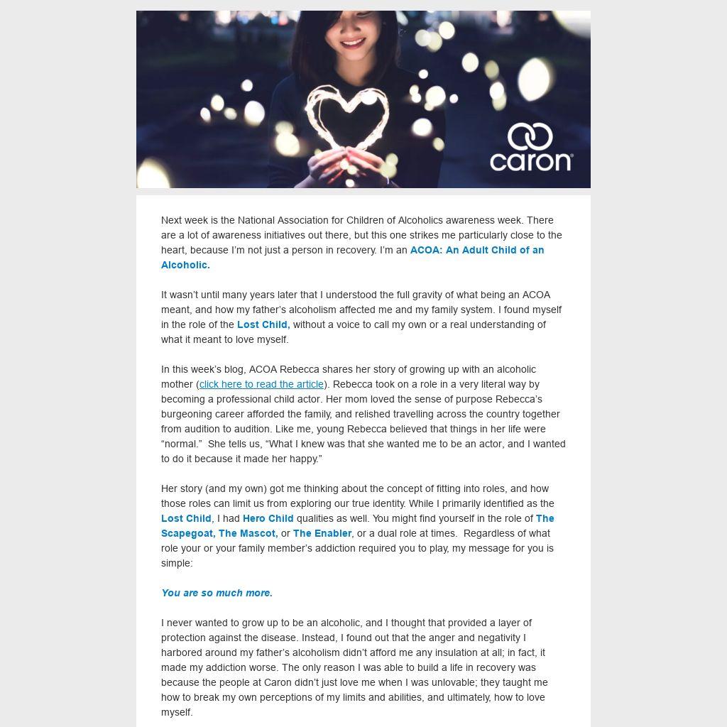 I never wanted to grow up to be an alcoholic, and I thought that provided a layer of protection against the disease. Instead, I found out that the anger and negativity I harbored around my father’s alcoholism didn’t afford me any insulation at all; in fact, it made my addiction worse. The only reason I was able to build a life in recovery was because the people at Caron didn’t just love me when I was unlovable; they taught me how to break my own perceptions of my limits and abilities, and ultimately, how to love myself.