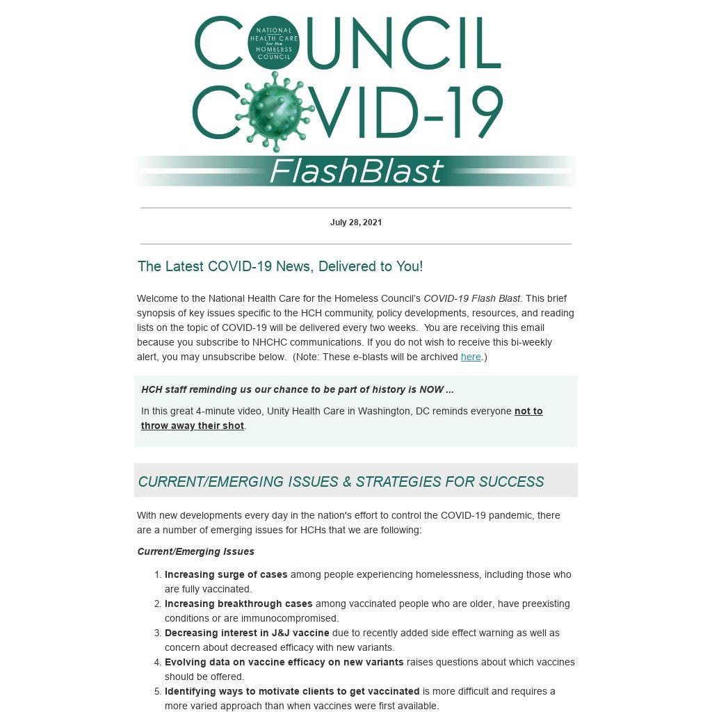 Welcome to the National Health Care for the Homeless Council’s COVID-19 Flash Blast. This brief synopsis of key issues specific to the HCH community, policy developments, resources, and reading lists on the topic of COVID-19 will be delivered every two weeks. You are receiving this email because you subscribe to NHCHC communications. If you do not wish to receive this bi-weekly alert, you may unsubscribe below. (Note: These e-blasts will be archived here.)