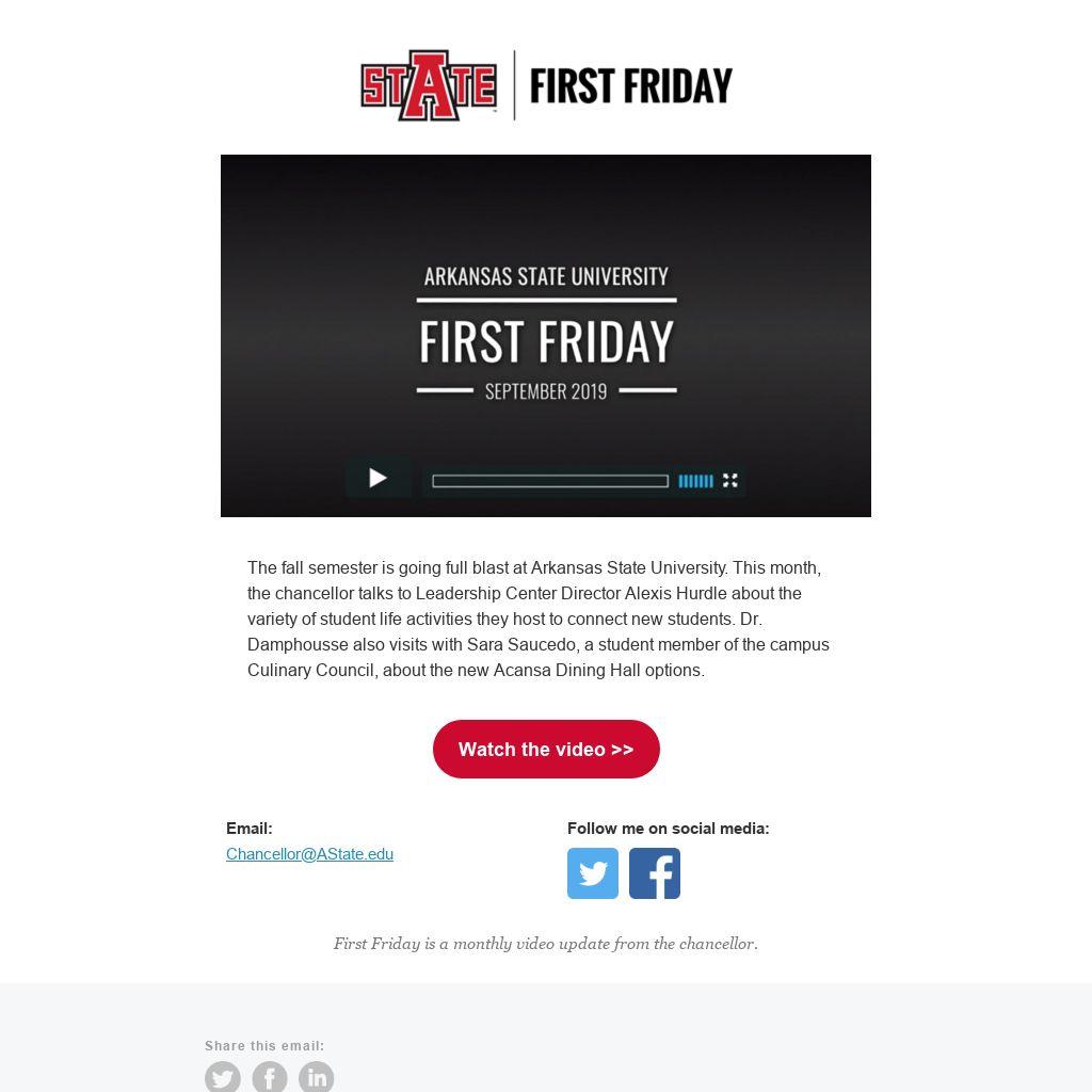 The fall semester is going full blast at Arkansas State University. This month, the chancellor talks to Leadership Center Director Alexis Hurdle about the variety of student life activities they host to connect new students. Dr. Damphousse also visits with Sara Saucedo, a student member of the campus Culinary Council, about the new Acansa Dining Hall options.