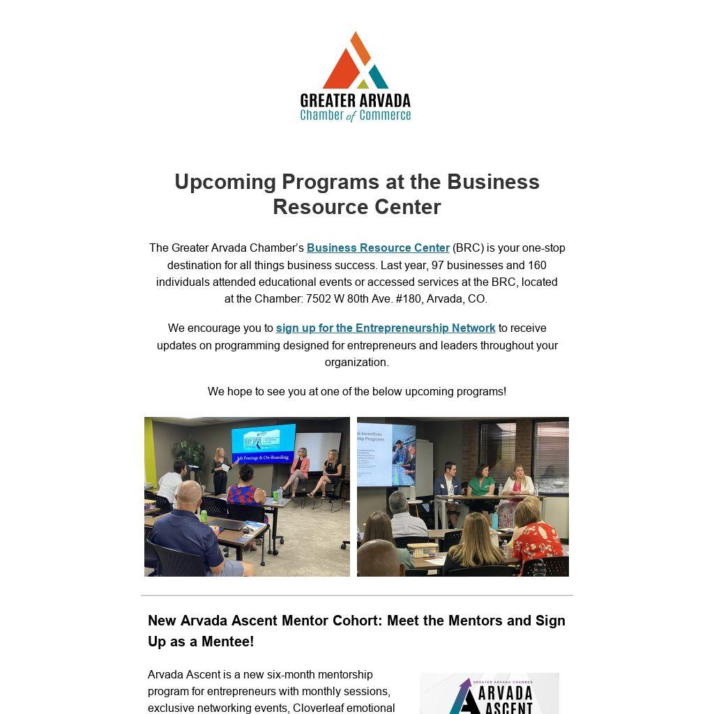 The Greater Arvada Chamber’s Business Resource Center (BRC) is your one-stop destination for all things business success. Last year, 97 businesses and 160 individuals attended educational events or accessed services at the BRC, located at the Chamber: 7502 W 80th Ave. #180, Arvada, CO.Â