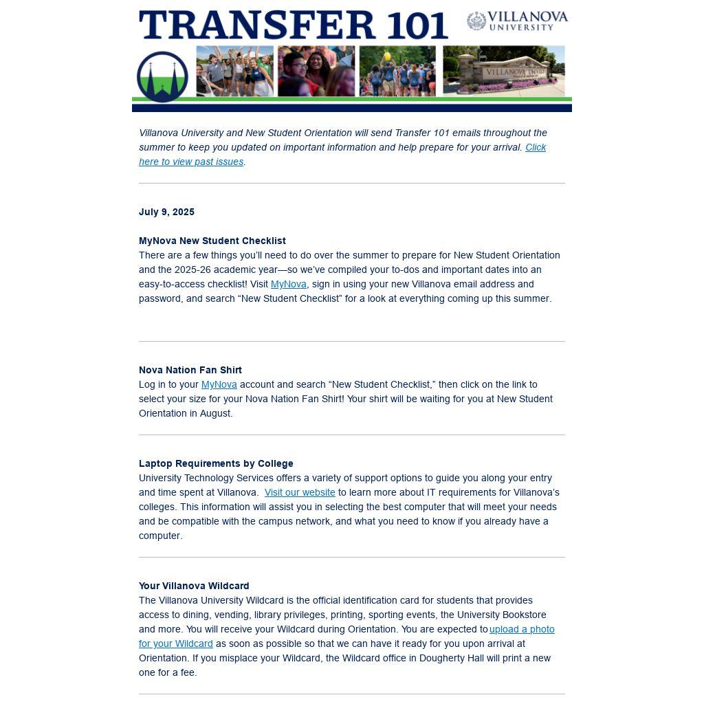 Villanova University and New Student Orientation will send Transfer 101 emails throughout the summer to keep you updated on important information and help prepare for your arrival. Click here to view past issues.
