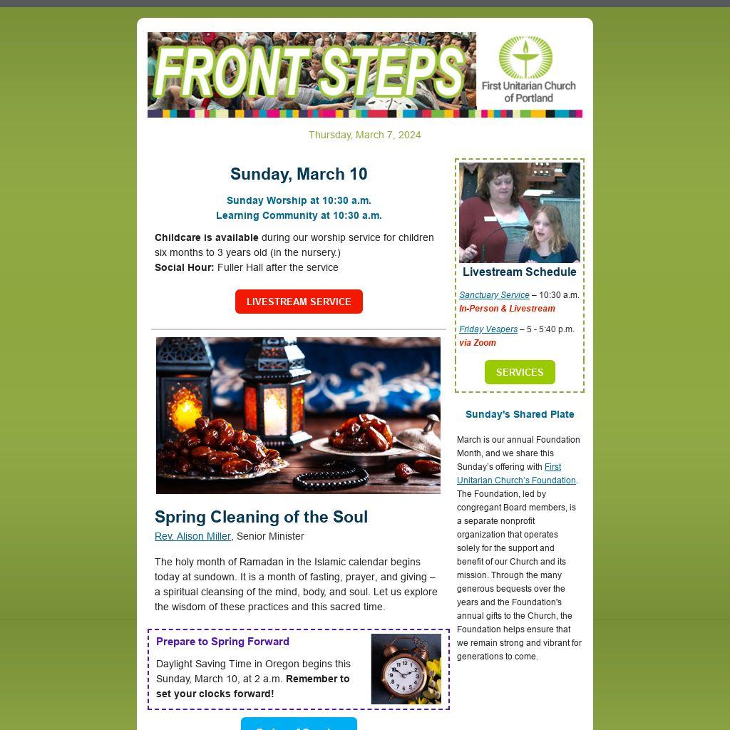 | March is Foundation Month at First Unitarian Portland. There will be opportunities to learn how you can join our current Foundation Legacy Society members to ensure our church remains a strong and active part of the lives of future generations through a planned gift.