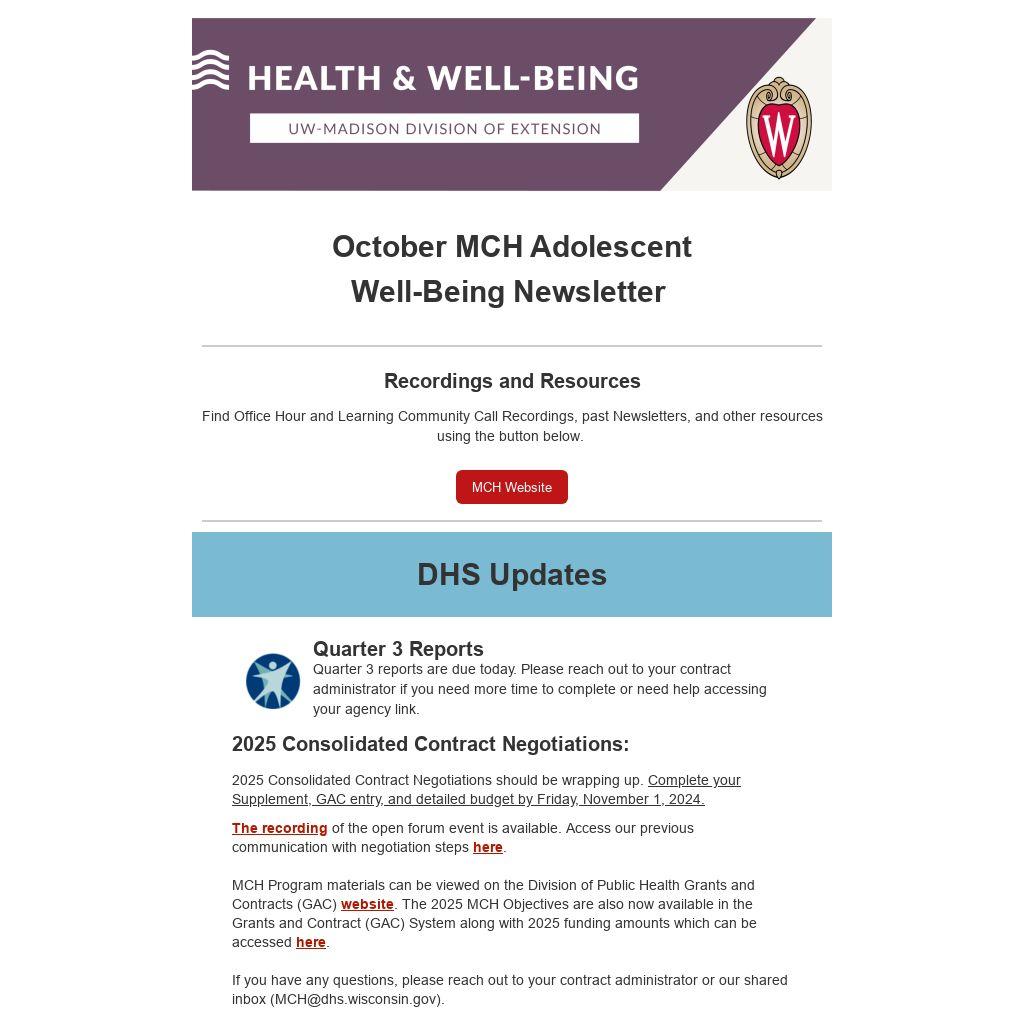 If you have any questions, please reach out to your contract administrator or our shared inbox (MCH@dhs.wisconsin.gov).