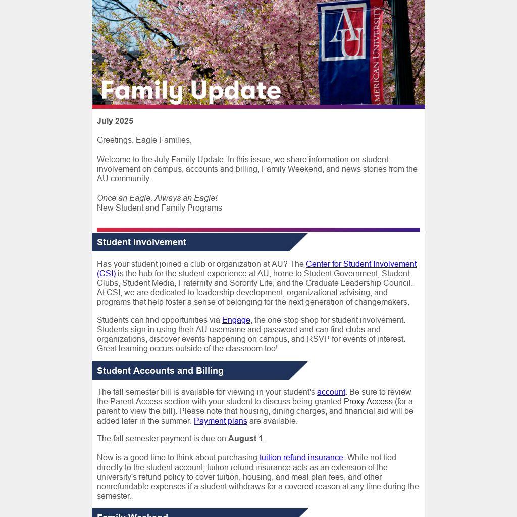 Welcome to the July Family Update. In this issue, we share information on student involvement on campus, accounts and billing, Family Weekend, and news stories from the AU community.
