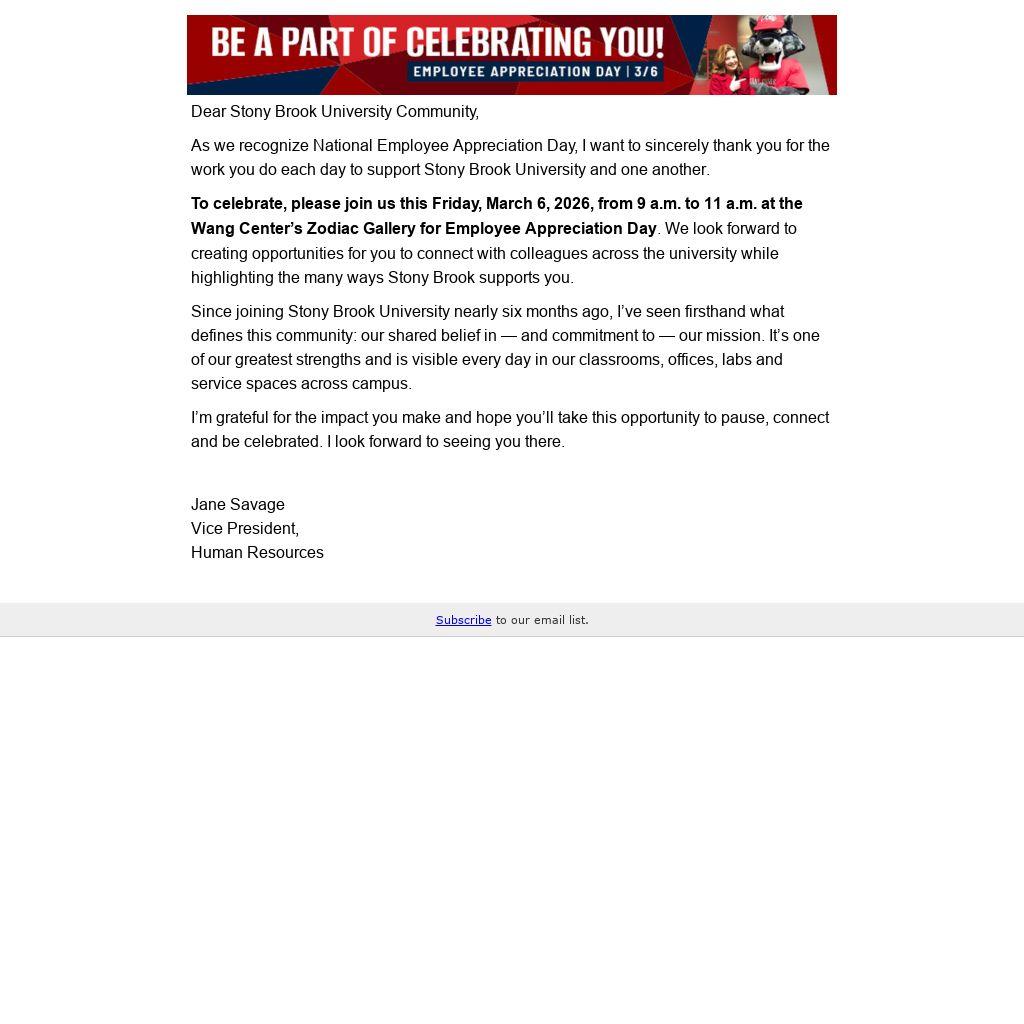 To celebrate, please join us this Friday, March 6, 2026, from 9 a.m. to 11 a.m. at the Wang Center’s Zodiac Gallery for Employee Appreciation Day. We look forward to creating opportunities for you to connect with colleagues across the university while highlighting the many ways Stony Brook supports you.