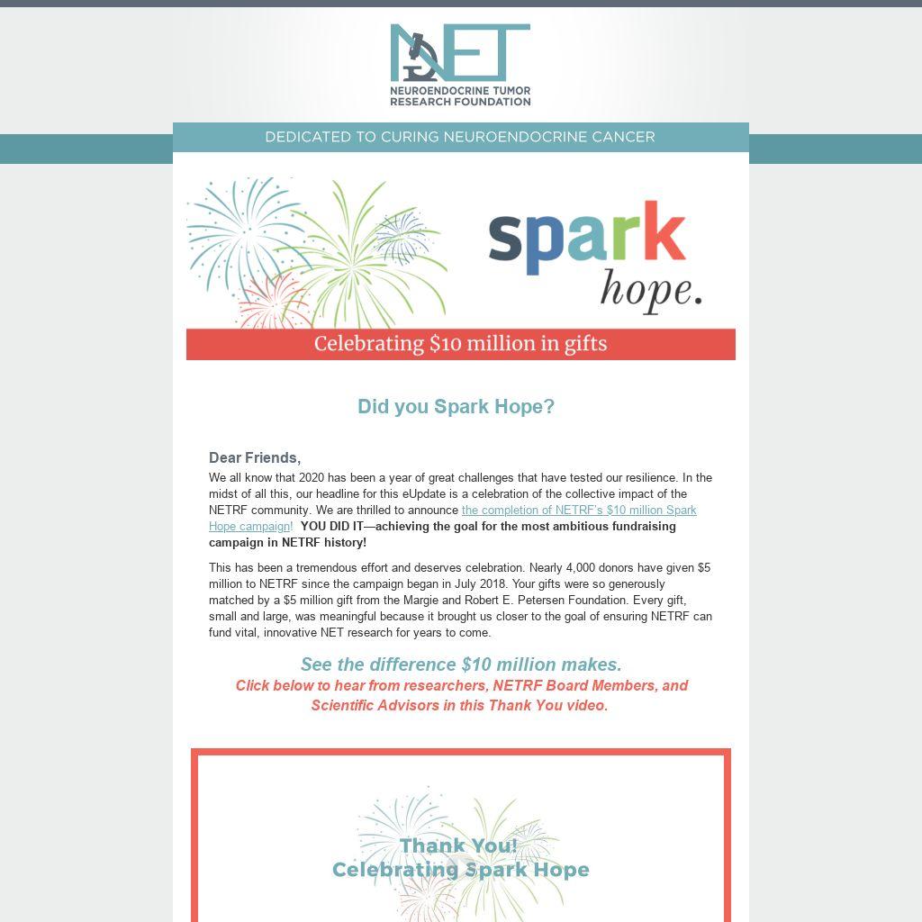 Dear Friends,We all know that 2020 has been a year of great challenges that have tested our resilience. In the midst of all this, our headline for this eUpdate is a celebration of the collective impact of the NETRF community. We are thrilled to announce the completion of NETRF’s $10 million Spark Hope campaign! YOU DID IT—achieving the goal for the most ambitious fundraising campaign in NETRF history!
