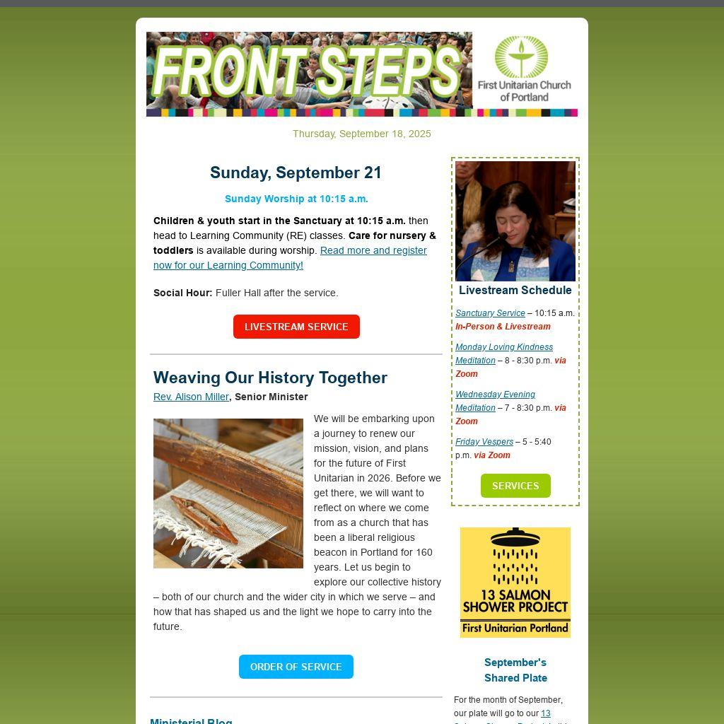 We’re proud to launch Hospitality with Heart & Hands at First Unitarian Portland, a team devoted to weaving community by serving with love and care. Learn more here in this week's Ministerial Blog. Supporting events, welcoming guests, assisting with outreach, and sharing cleanup duties, this team helps weave a welcoming and loving fabric where everyone feels at home. Join Heart & Hands Hospitality and become a vital thread in our congregation’s tapestry. Sign up here.Â