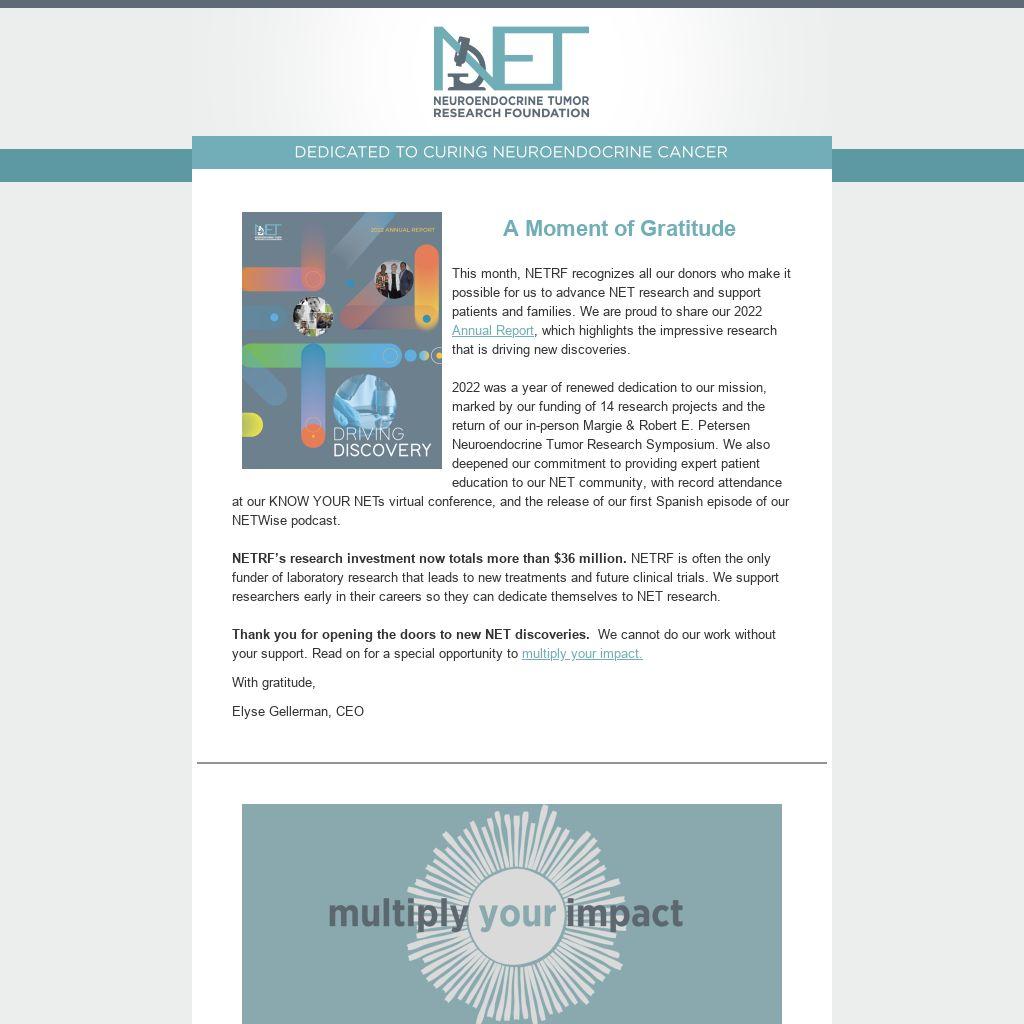 As you know, more often than not, NETRF is the only funding source available for many scientists working to understand this complicated and uncommon cancer. Whether through the renewal of your annual gift, the sponsorship of a research award, or hosting a fundraiser, you have a life-changing impact.