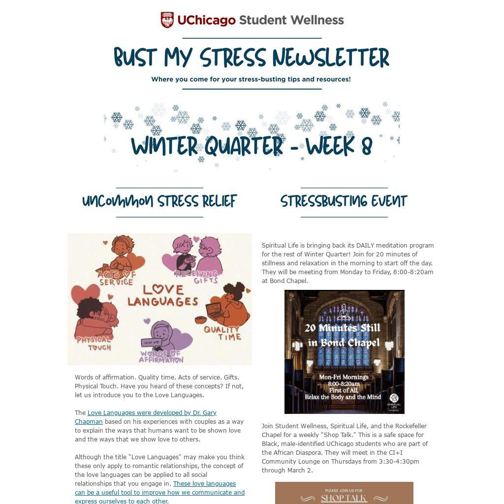Take 10 is an initiative intended to encourage all members of the UChicago community to rest and connect with others. Join us to participate in Take 10 events from 12:30 PM - 2:30 PM across campus on odd-week Thursdays this quarter! We hope you drop by and take 10!