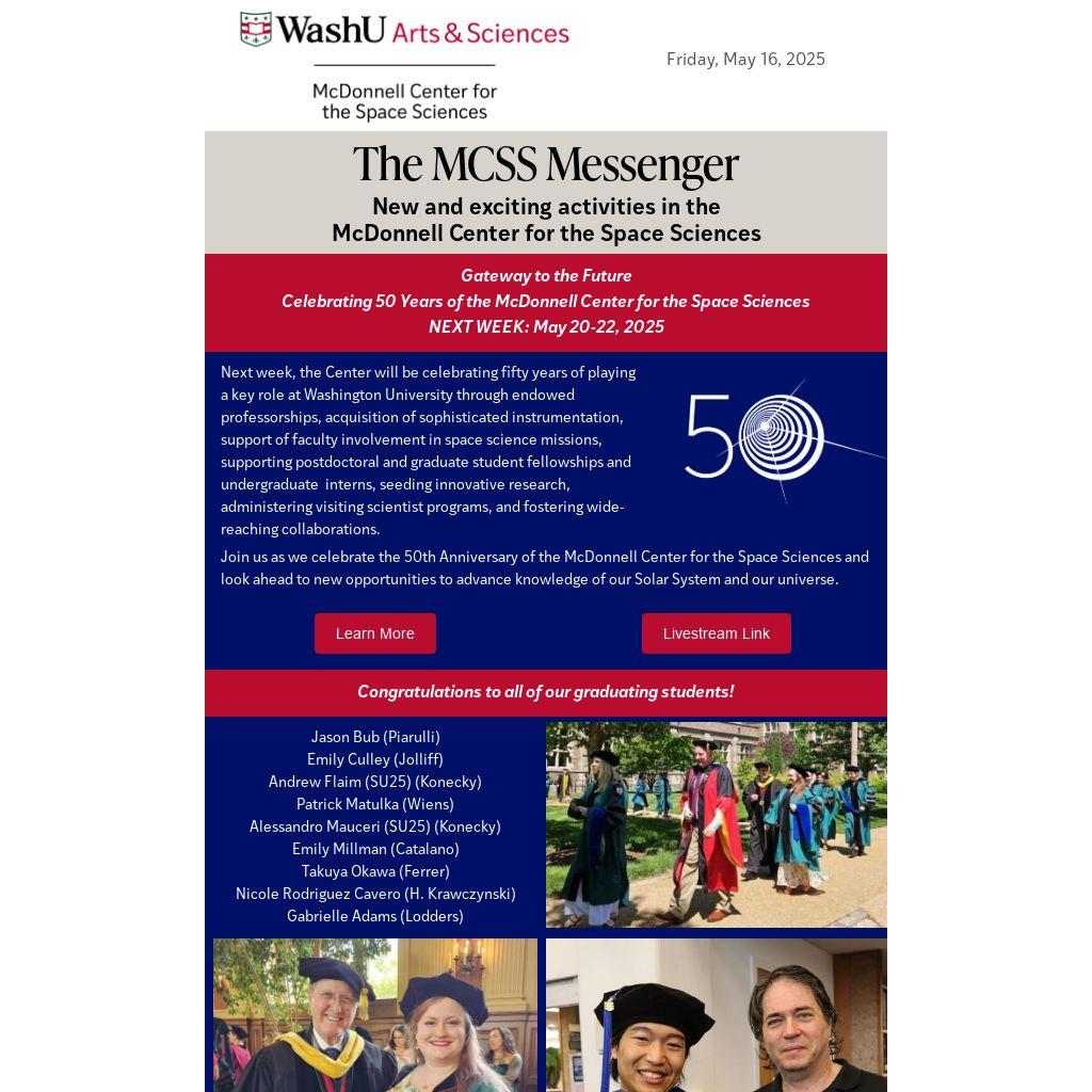 Join us as we celebrate the 50th Anniversary of the McDonnell Center for the Space Sciences and look ahead to new opportunities to advance knowledge of our Solar System and our universe.