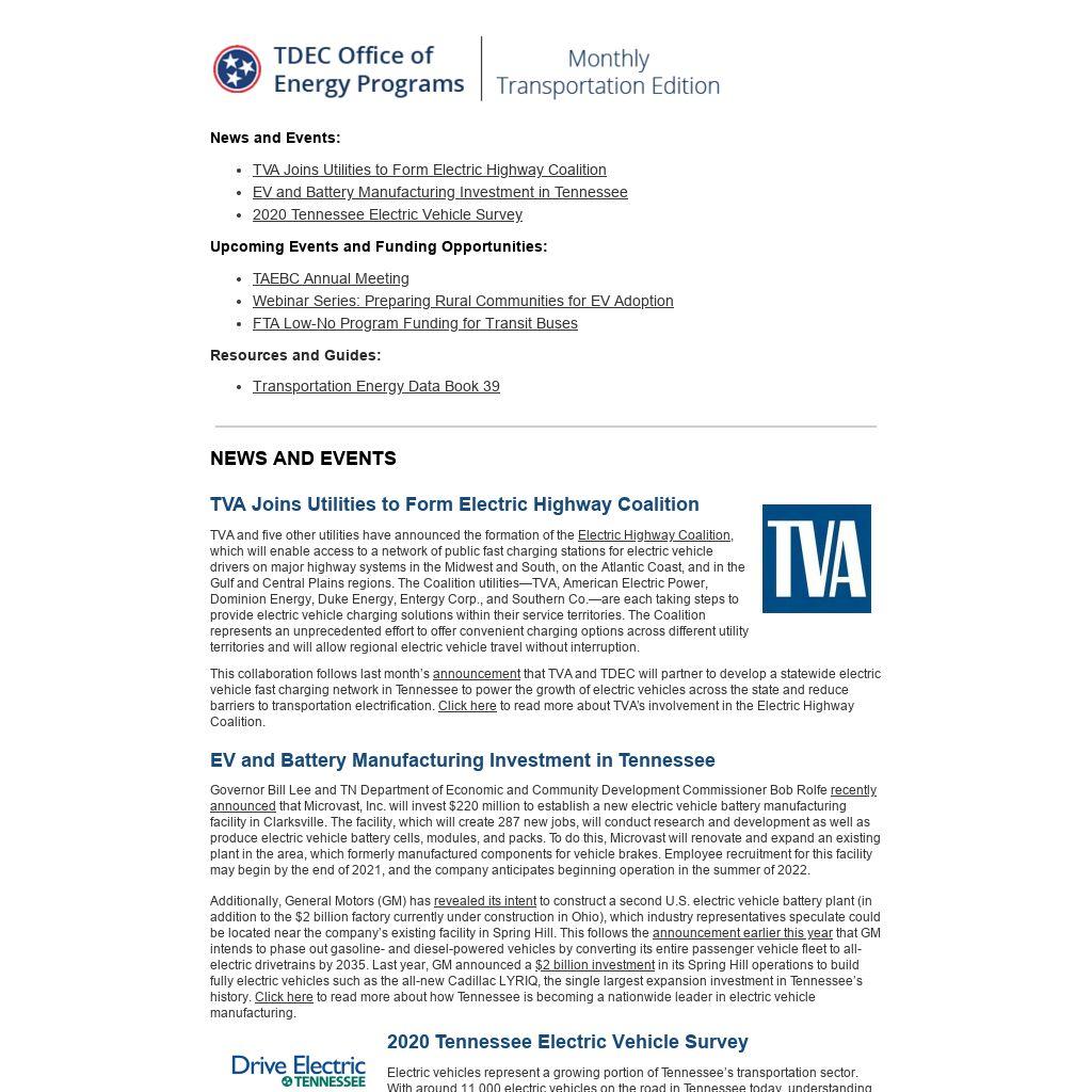 This collaboration follows last month’s announcement that TVA and TDEC will partner to develop a statewide electric vehicle fast charging network in Tennessee to power the growth of electric vehicles across the state and reduce barriers to transportation electrification. Click here to read more about TVA’s involvement in the Electric Highway Coalition.