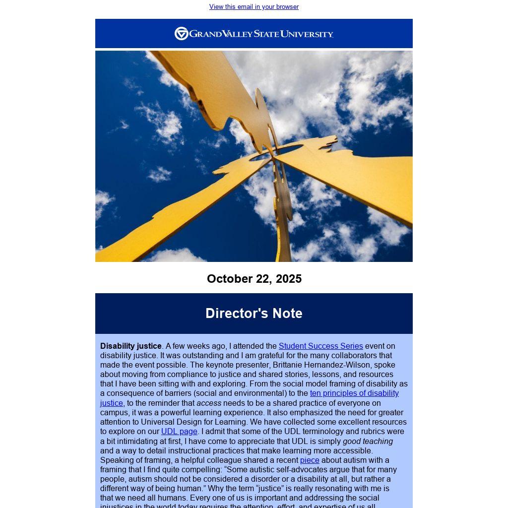 Disability justice. A few weeks ago, I attended the Student Success Series event on disability justice. It was outstanding and I am grateful for the many collaborators that made the event possible. The keynote presenter, Brittanie Hernandez-Wilson, spoke about moving from compliance to justice and shared stories, lessons, and resources that I have been sitting with and exploring. From the social model framing of disability as a consequence of barriers (social and environmental) to the ten principles of disability justice, to the reminder that access needs to be a shared practice of everyone on campus, it was a powerful learning experience. It also emphasized the need for greater attention to Universal Design for Learning. We have collected some excellent resources to explore on our UDL page. I admit that some of the UDL terminology and rubrics were a bit intimidating at first, I have come to appreciate that UDL is simply good teaching and a way to detail instructional practices that make learning more accessible. Speaking of framing, a helpful colleague shared a recent piece about autism with a framing that I find quite compelling: “Some autistic self-advocates argue that for many people, autism should not be considered a disorder or a disability at all, but rather a different way of being human.” Why the term “justice” is really resonating with me is that we need all humans. Every one of us is important and addressing the social injustices in the world today requires the attention, effort, and expertise of us all.