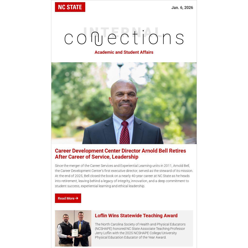 Since the merger of the Career Services and Experiential Learning units in 2011, Arnold Bell, the Career Development Center’s first executive director, served as the steward of its mission. At the end of 2025, Bell closed the book on a nearly 40-year career at NC State as he heads into retirement, leaving behind a legacy of integrity, innovation, and a deep commitment to student success, experiential learning and ethical leadership.