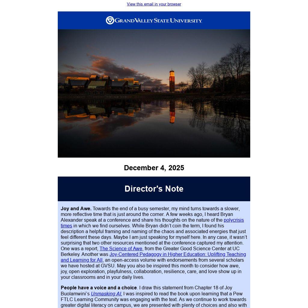 Joy and Awe. Towards the end of a busy semester, my mind turns towards a slower, more reflective time that is just around the corner. A few weeks ago, I heard Bryan Alexander speak at a conference and share his thoughts on the nature of the polycrisis times in which we find ourselves. While Bryan didn’t coin the term, I found his description a helpful framing and naming of the chaos and associated energies that just feel different these days. Maybe I am just speaking for myself here. In any case, it wasn’t surprising that two other resources mentioned at the conference captured my attention. One was a report, The Science of Awe, from the Greater Good Science Center at UC Berkeley. Another was Joy-Centered Pedagogy in Higher Education: Uplifting Teaching and Learning for All, an open-access volume with endorsements from several scholars we have hosted at GVSU. May you also be inspired this month to consider how awe, joy, open exploration, playfulness, collaboration, resilience, care, and love show up in your classrooms and in your daily lives.