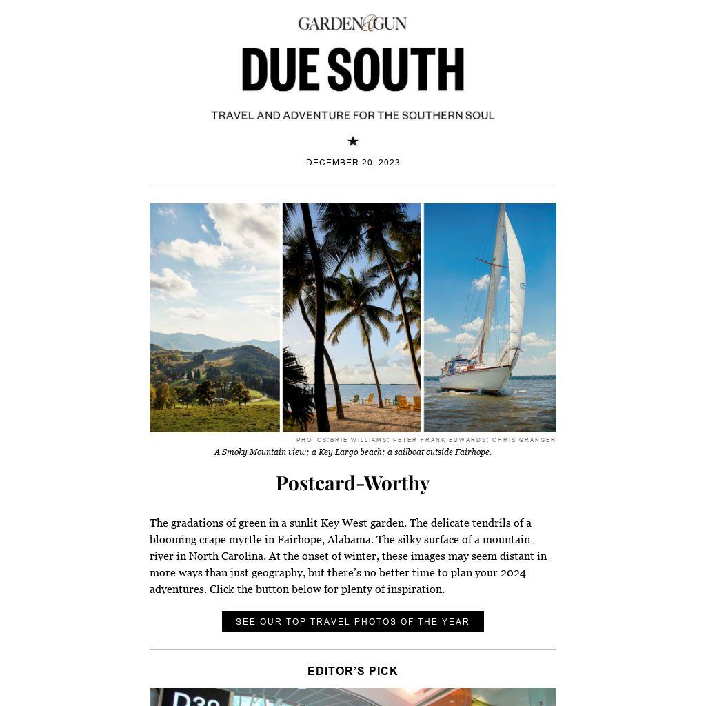 The gradations of green in a sunlit Key West garden. The delicate tendrils of a blooming crape myrtle in Fairhope, Alabama. The silky surface of a mountain river in North Carolina. At the onset of winter, these images may seem distant in more ways than just geography, but there’s no better time to plan your 2024 adventures. Click the button below for plenty of inspiration.