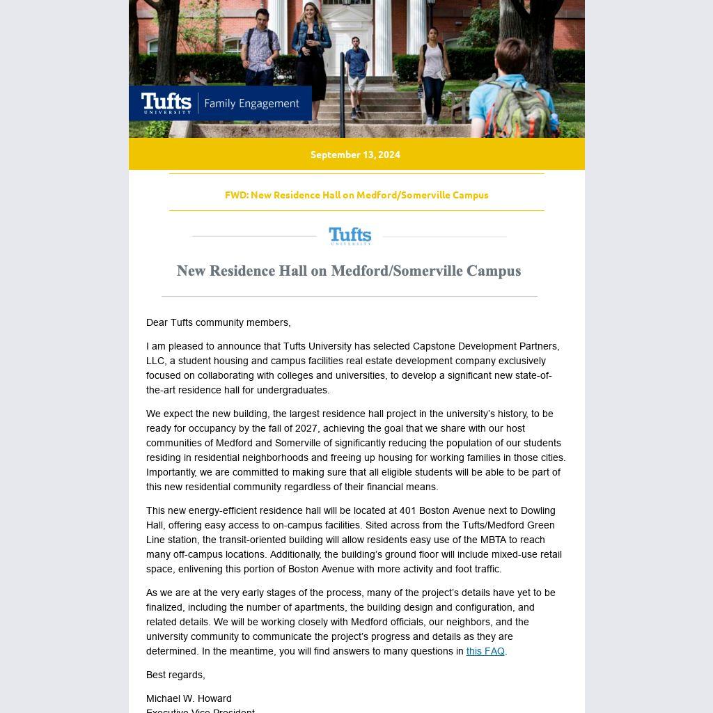 We expect the new building, the largest residence hall project in the university’s history, to be ready for occupancy by the fall of 2027, achieving the goal that we share with our host communities of Medford and Somerville of significantly reducing the population of our students residing in residential neighborhoods and freeing up housing for working families in those cities. Importantly, we are committed to making sure that all eligible students will be able to be part of this new residential community regardless of their financial means.