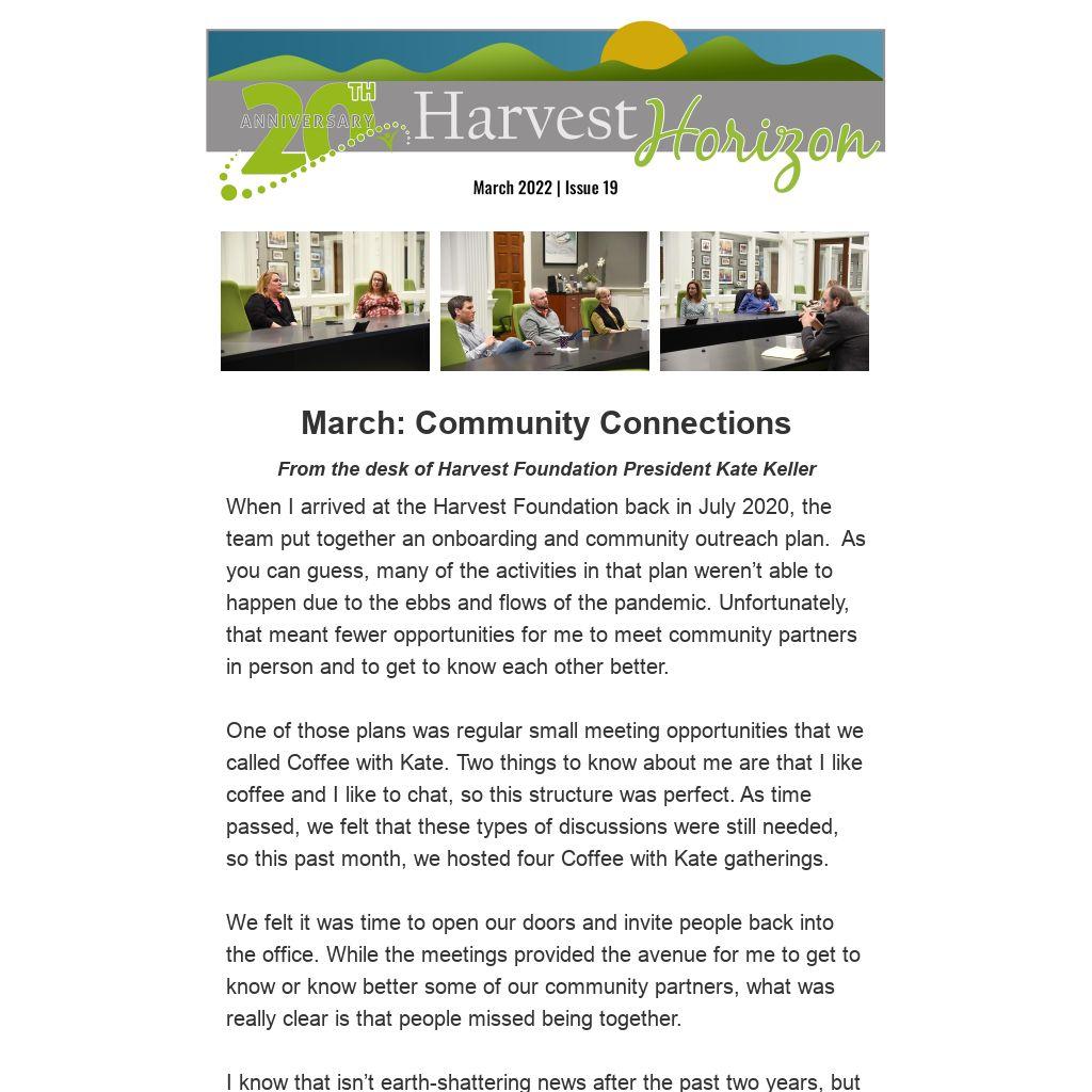 When I arrived at the Harvest Foundation back in July 2020, the team put together an onboarding and community outreach plan. As you can guess, many of the activities in that plan weren’t able to happen due to the ebbs and flows of the pandemic. Unfortunately, that meant fewer opportunities for me to meet community partners in person and to get to know each other better.