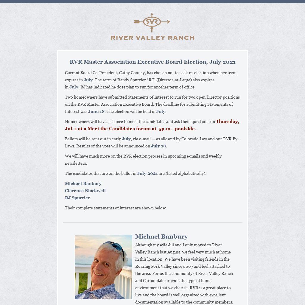 RJ believes strongly in the RVR Master Associations role in protecting member’s property values and in serving in the interests of the community. RJ asks for your support and your vote has he seeks a three-year term to continue to serve the community on the RVR Executive Board.