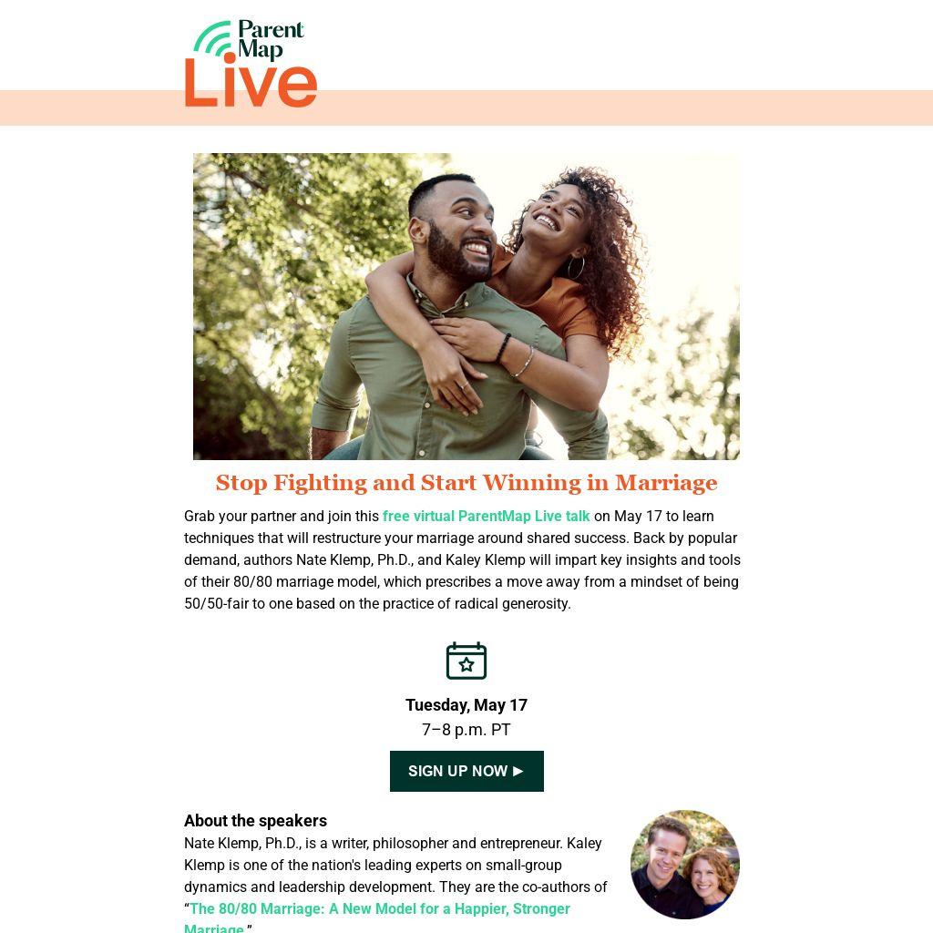 Grab your partner and join this free virtual ParentMap Live talk on May 17 to learn techniques that will restructure your marriage around shared success. Back by popular demand, authors Nate Klemp, Ph.D., and Kaley Klemp will impart key insights and tools of their 80/80 marriage model, which prescribes a move away from a mindset of being 50/50-fair to one based on the practice of radical generosity.