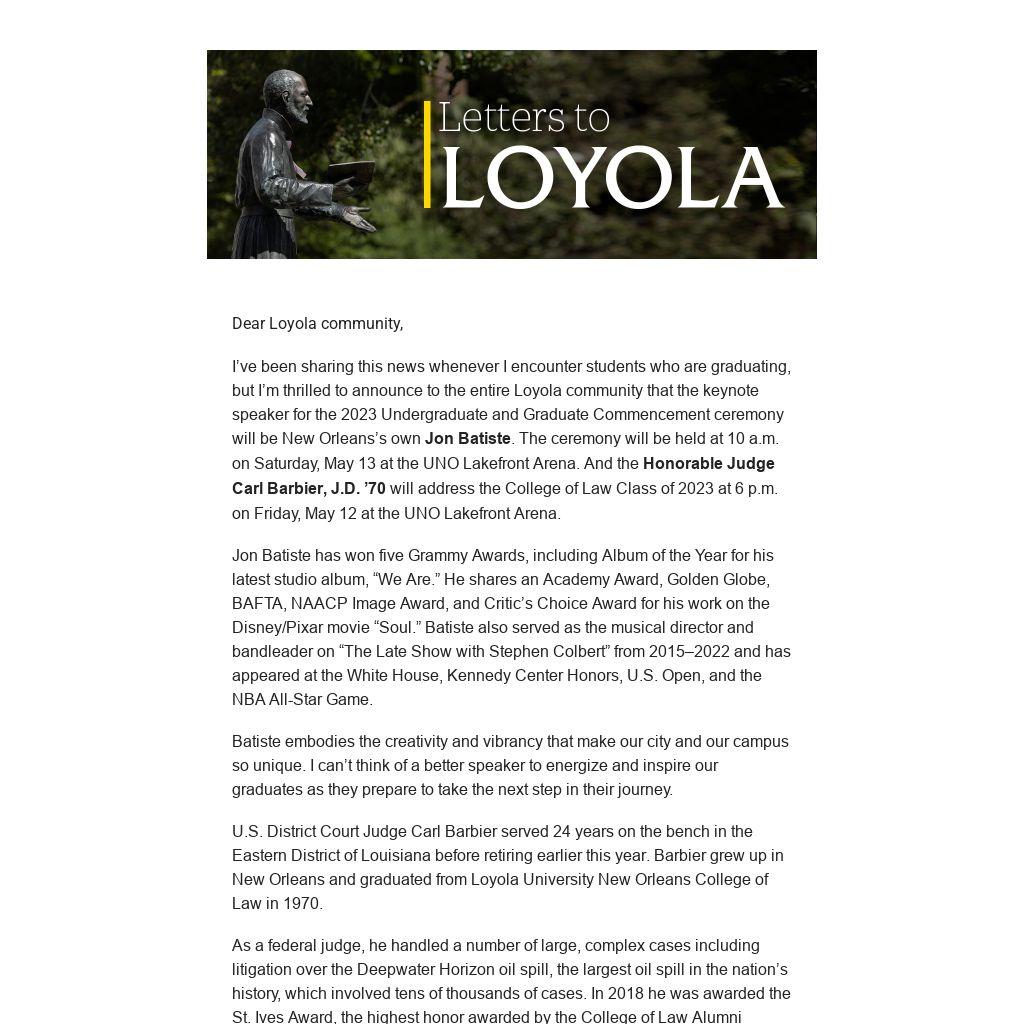 I’ve been sharing this news whenever I encounter students who are graduating, but I’m thrilled to announce to the entire Loyola community that the keynote speaker for the 2023 Undergraduate and Graduate Commencement ceremony will be New Orleans’s own Jon Batiste. The ceremony will be held at 10 a.m. on Saturday, May 13 at the UNO Lakefront Arena. And the Honorable Judge Carl Barbier, J.D. ’70 will address the College of Law Class of 2023 at 6 p.m. on Friday, May 12 at the UNO Lakefront Arena.