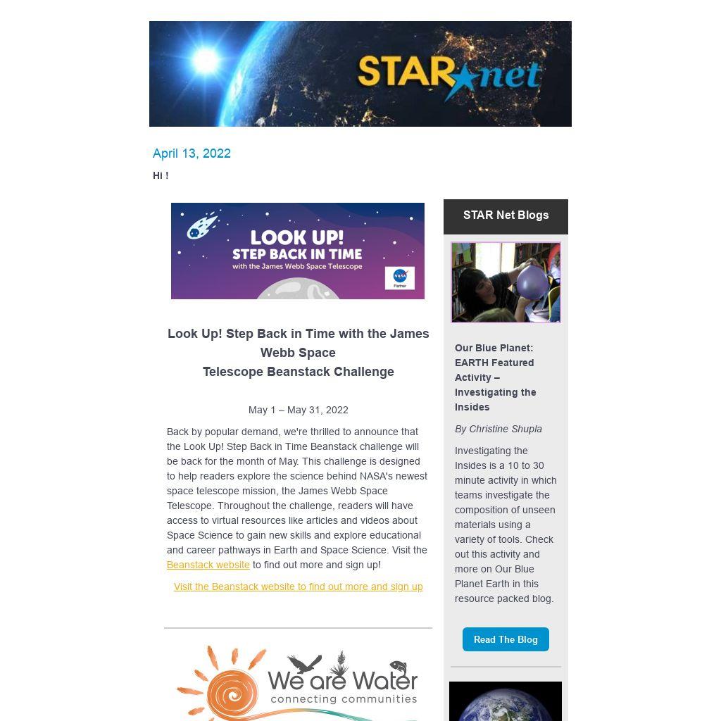 Back by popular demand, we're thrilled to announce that the Look Up! Step Back in Time Beanstack challenge will be back for the month of May. This challenge is designed to help readers explore the science behind NASA's newest space telescopemission, the James Webb Space Telescope. Throughout the challenge, readers will have access to virtual resources like articles and videos about Space Science to gain new skills and explore educational and career pathways in Earth and Space Science. Visit the Beanstack websiteto find out more and sign up!
