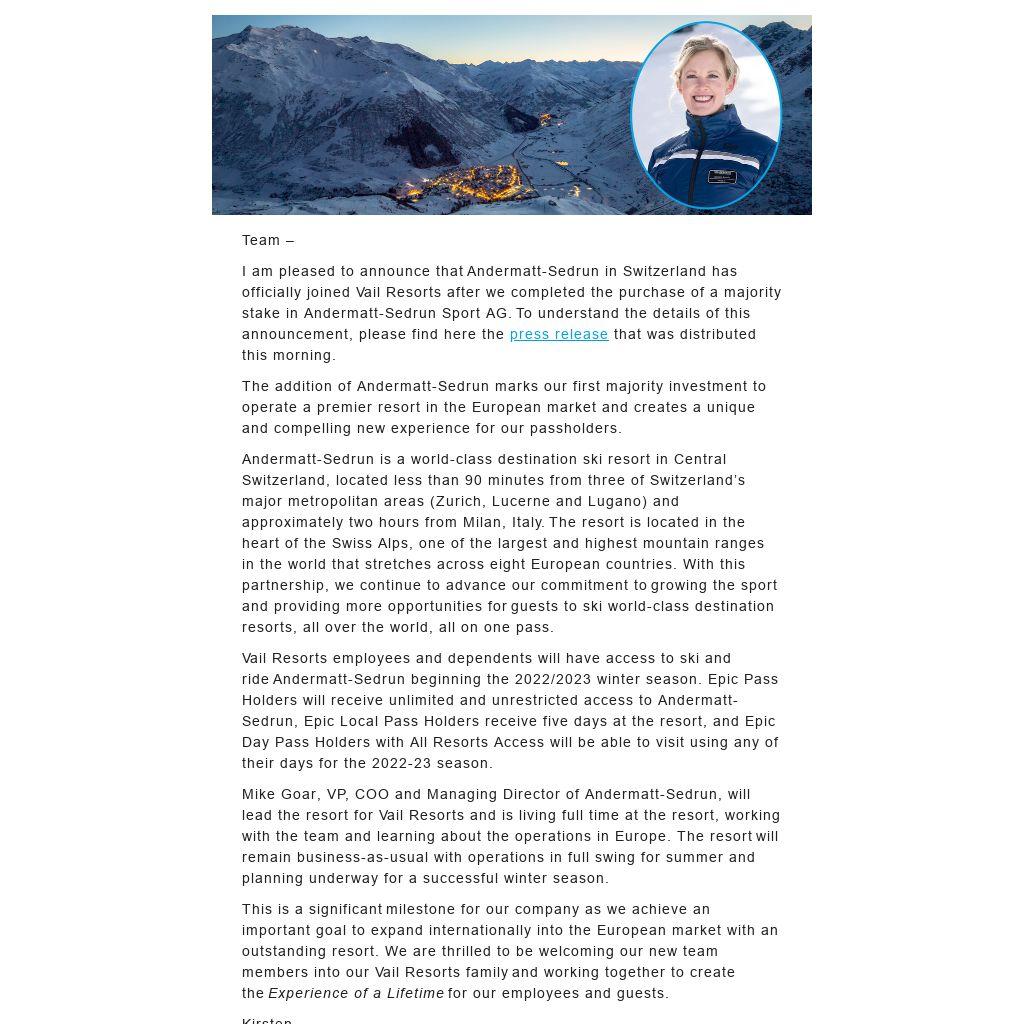 I am pleased to announce that Andermatt-Sedrun in Switzerland has officially joined Vail Resorts after we completed the purchase of a majority stake in Andermatt-Sedrun Sport AG. To understand the details of this announcement, please find here the press release that was distributed this morning.