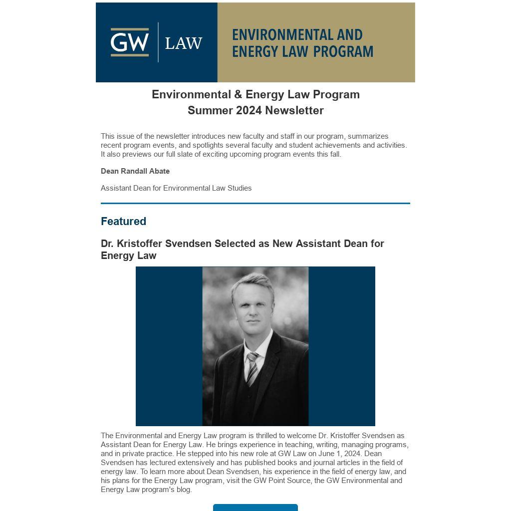 The Environmental and Energy Law program is thrilled to welcome Dr. Kristoffer Svendsen as Assistant Dean for Energy Law. He brings experience in teaching, writing, managing programs, and in private practice. He stepped into his new role at GW Law on June 1, 2024. Dean Svendsen has lectured extensively and has published books and journal articles in the field of energy law. To learn more about Dean Svendsen, his experience in the field of energy law, and his plans for the Energy Law program, visit the GW Point Source, the GW Environmental and Energy Law program's blog.