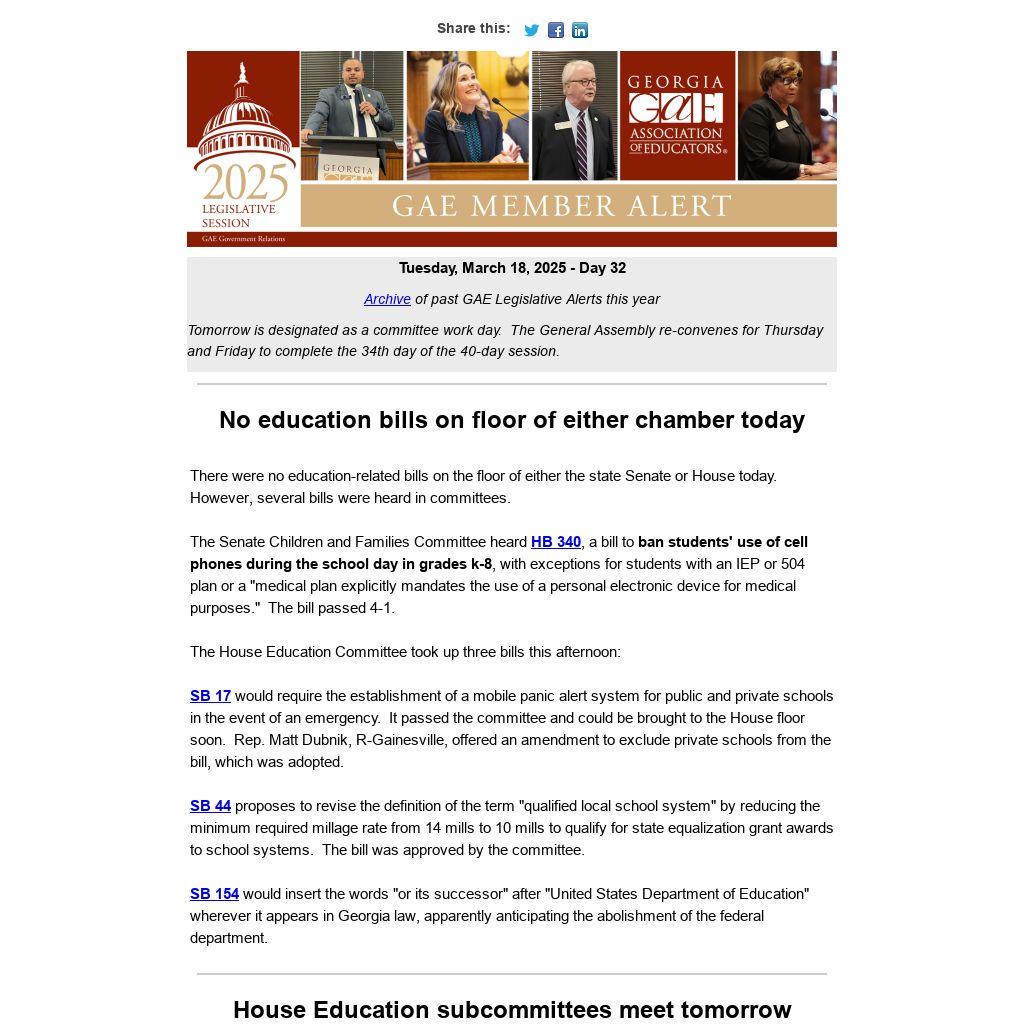 There were no education-related bills on the floor of either the state Senate or House today. However, several bills were heard in committees.