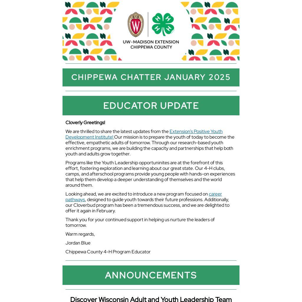 For a detailed list of upcoming county events, visit our Chippewa County 4-H Youth Development website at go.wisc.edu/chippewa4hevents. There, you can find all the details on upcoming events, important deadline reminders, and much more.