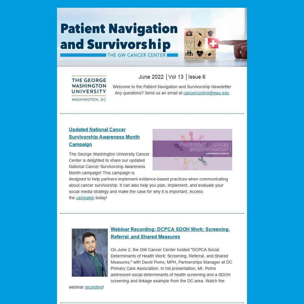 The George Washington University Cancer Center is delighted to share our updated National Cancer Survivorship Awareness Month campaign! This campaign is designed to help partners implement evidence-based practices when communicating about cancer survivorship. It can also help you plan, implement, and evaluate your social media strategy and make the case for why it is important. Access the campaign today!