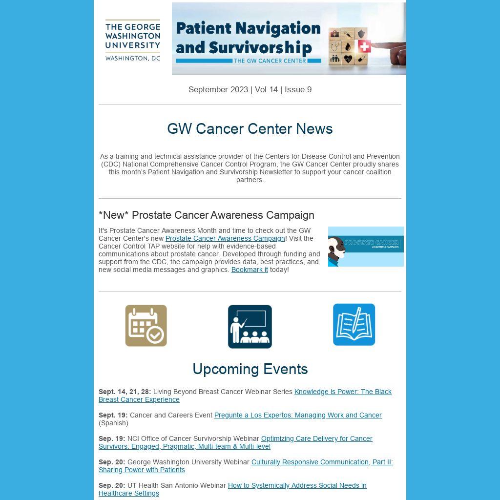 As a training and technical assistance provider of the Centers for Disease Control and Prevention (CDC) National Comprehensive Cancer Control Program, the GW Cancer Center proudly shares this month’s Patient Navigation and Survivorship Newsletter to support your cancer coalition partners.