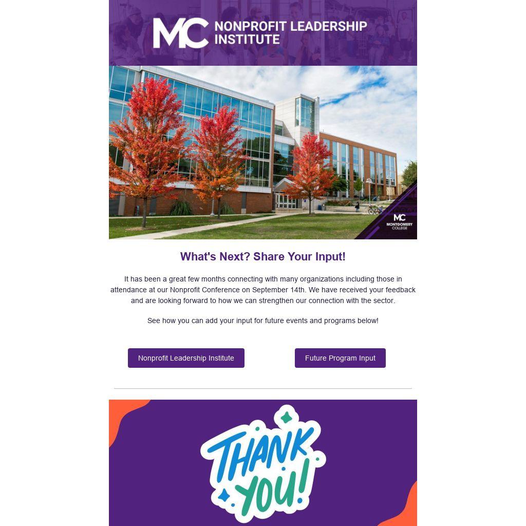 The Nonprofit Leadership Institute at Montgomery College's mission is to inspire our students to make a difference in our community. We strive to enhance or improve the skills and knowledge of your team. By combining our experienced facilitators with our course offerings, we can tailor your experience with us to your organization's needs.