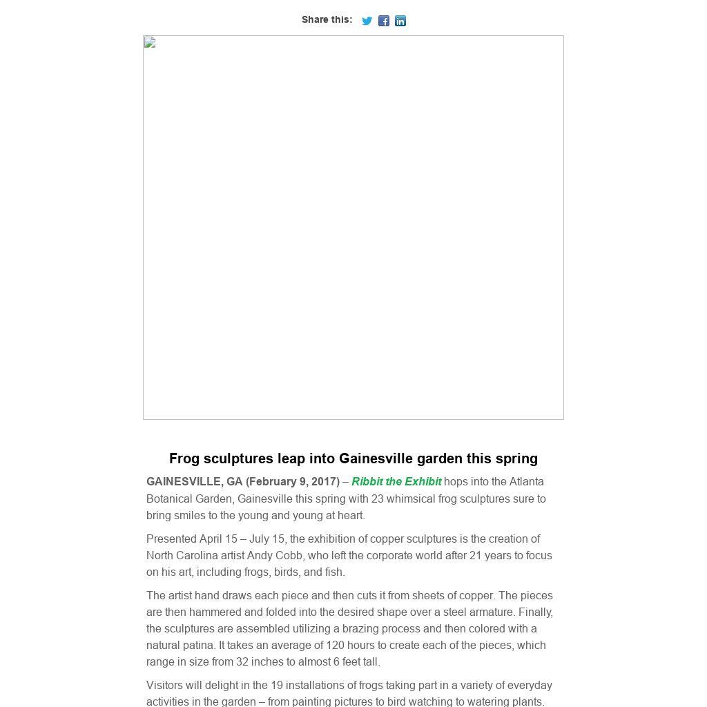 GAINESVILLE, GA (February 9, 2017) – Ribbit the Exhibit hops into the Atlanta Botanical Garden, Gainesville this spring with 23 whimsical frog sculptures sure to bring smiles to the young and young at heart.