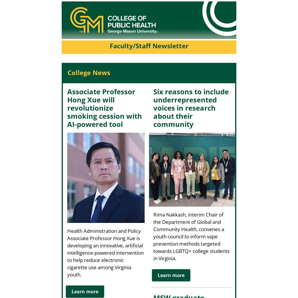 This week you may notice a new look to the newsletter. We're trying out a new template with the new branding. The newsletter may change some throughout the summer. Like something about it? Find it difficult to read? Please provide feedback to jpocock@gmu.edu. Thanks!
