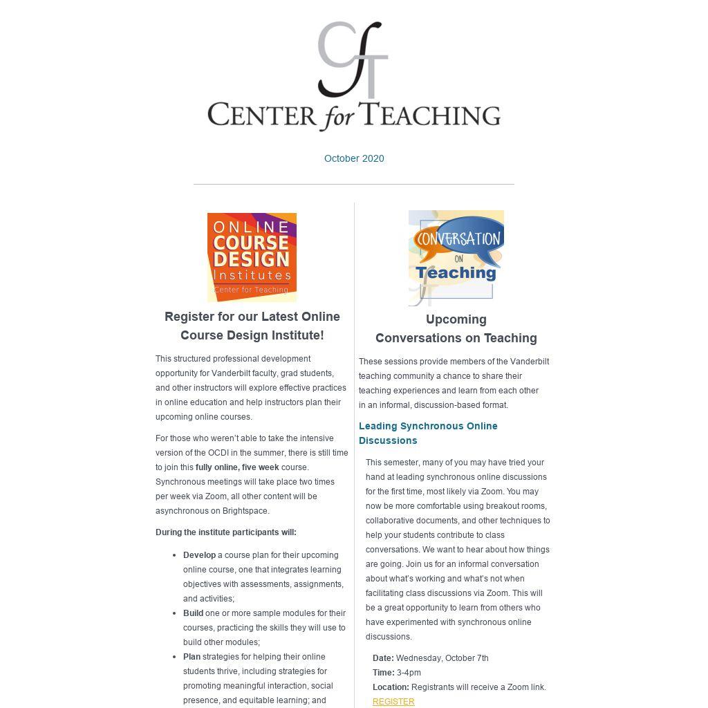This structured professional development opportunity for Vanderbilt faculty, grad students, and other instructors will explore effective practices in online education and help instructors plan their upcoming online courses.