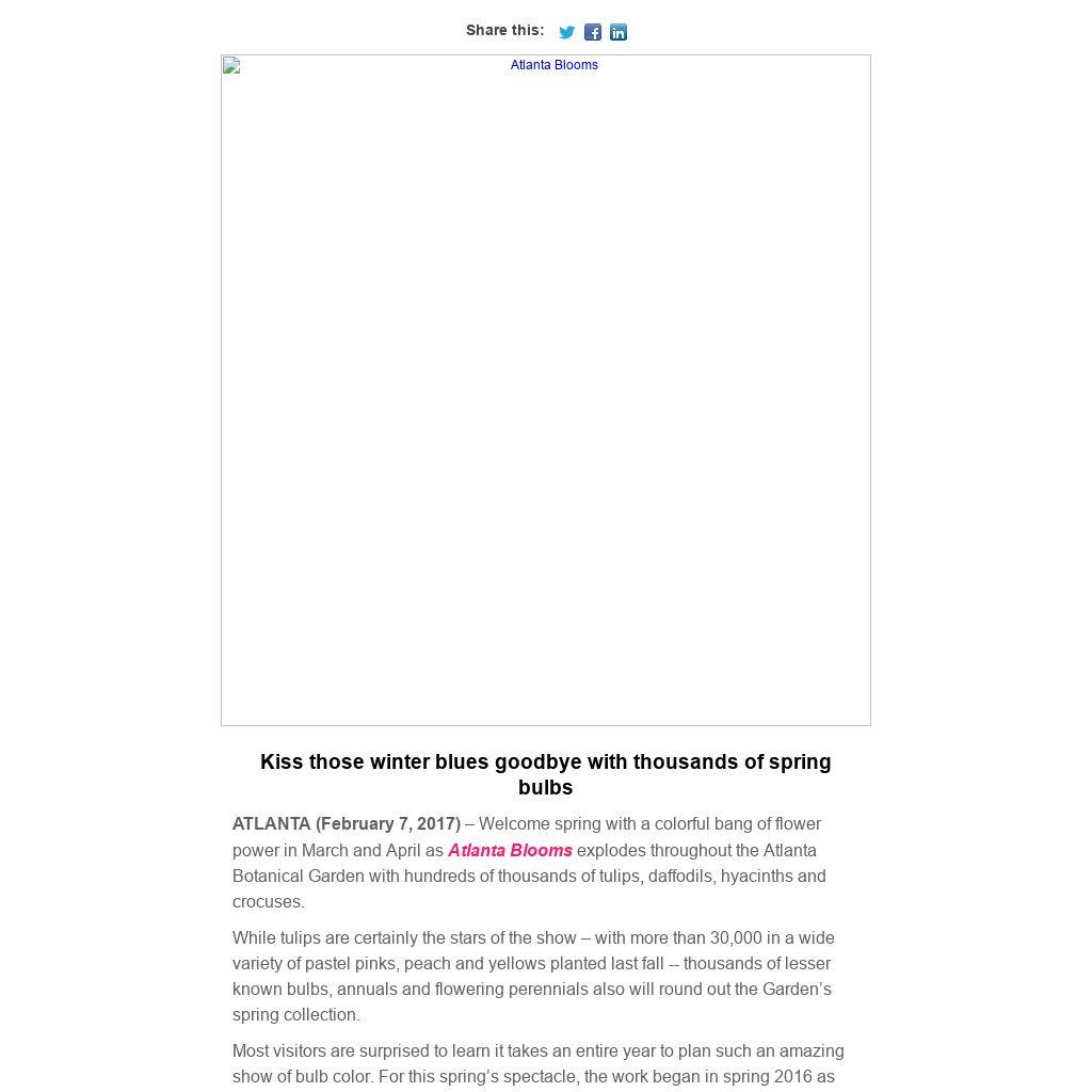 ATLANTA (February 7, 2017) – Welcome spring with a colorful bang of flower power in March and April as Atlanta Blooms explodes throughout the Atlanta Botanical Garden with hundreds of thousands of tulips, daffodils, hyacinths and crocuses.