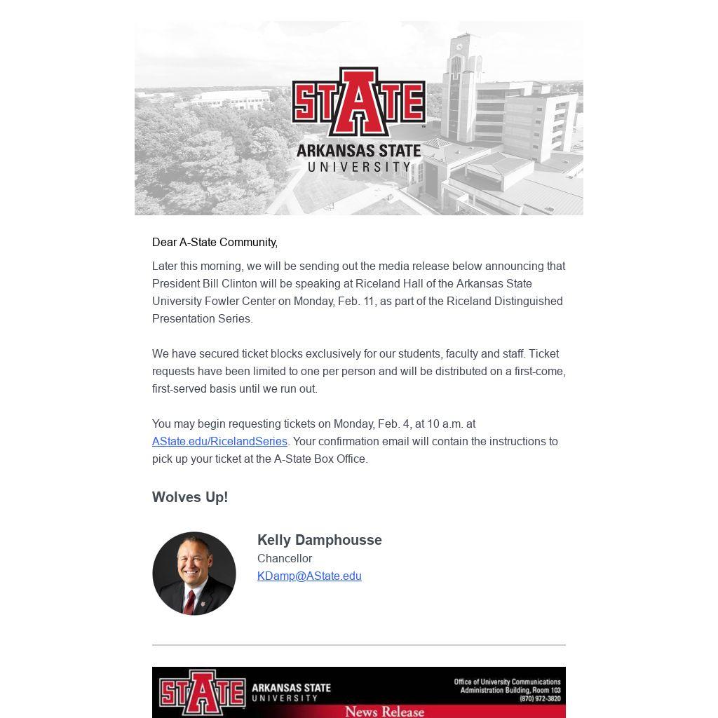 JONESBORO – President Bill Clinton, the founder of the Clinton Foundation and 42nd President of the United States, will speak at Riceland Hall of Fowler Center on the Arkansas State University campus, Monday, Feb. 11.