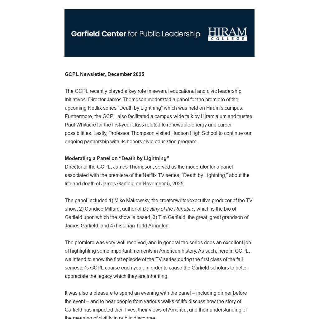 The GCPL recently played a key role in several educational and civic leadership initiatives. Director James Thompson moderated a panel for the premiere of the upcoming Netflix series “Death by Lightning” which was held on Hiram’s campus. Furthermore, the GCPL also facilitated a campus-wide talk by Hiram alum and trustee Paul Whitacre for the first-year class related to renewable energy and career possibilities. Lastly, Professor Thompson visited Hudson High School to continue our ongoing partnership with its honors civic-education program.