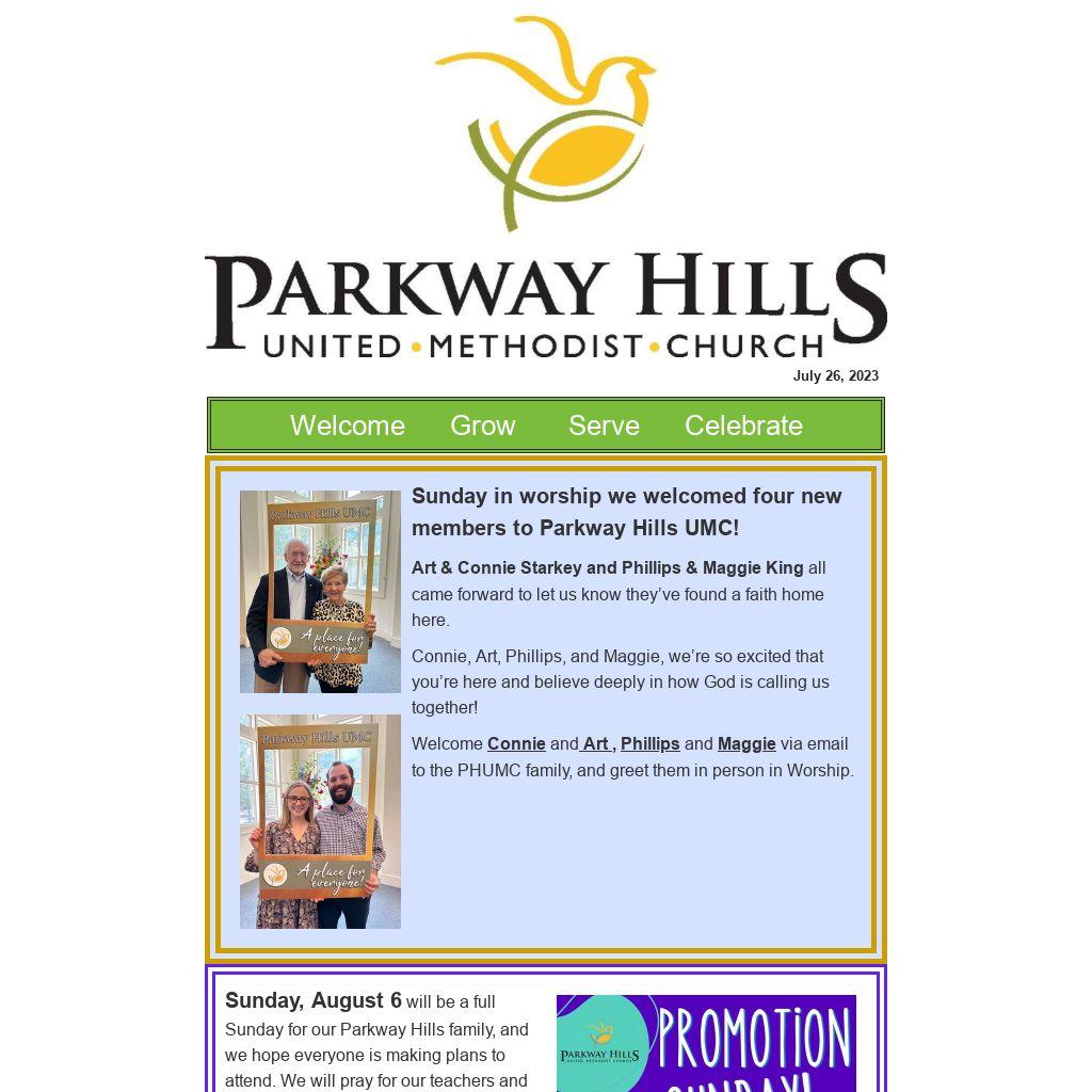 Sunday, August 6 will be a full Sunday for our Parkway Hills family, and we hope everyone is making plans to attend. We will pray for our teachers and students as a new year begins, be blessed with special music from our adult and children handbells, mark milestones as we hand out Kindergarten and 3rd grade Bibles, celebrate Promotion Sunday, wrap up our Great Church Chill Out worship series, and end the day with food and fun for our kids and youth. This would be a great Sunday to invite a teacher and/or family to join you at Parkway Hills UMC! Check out all the times below: