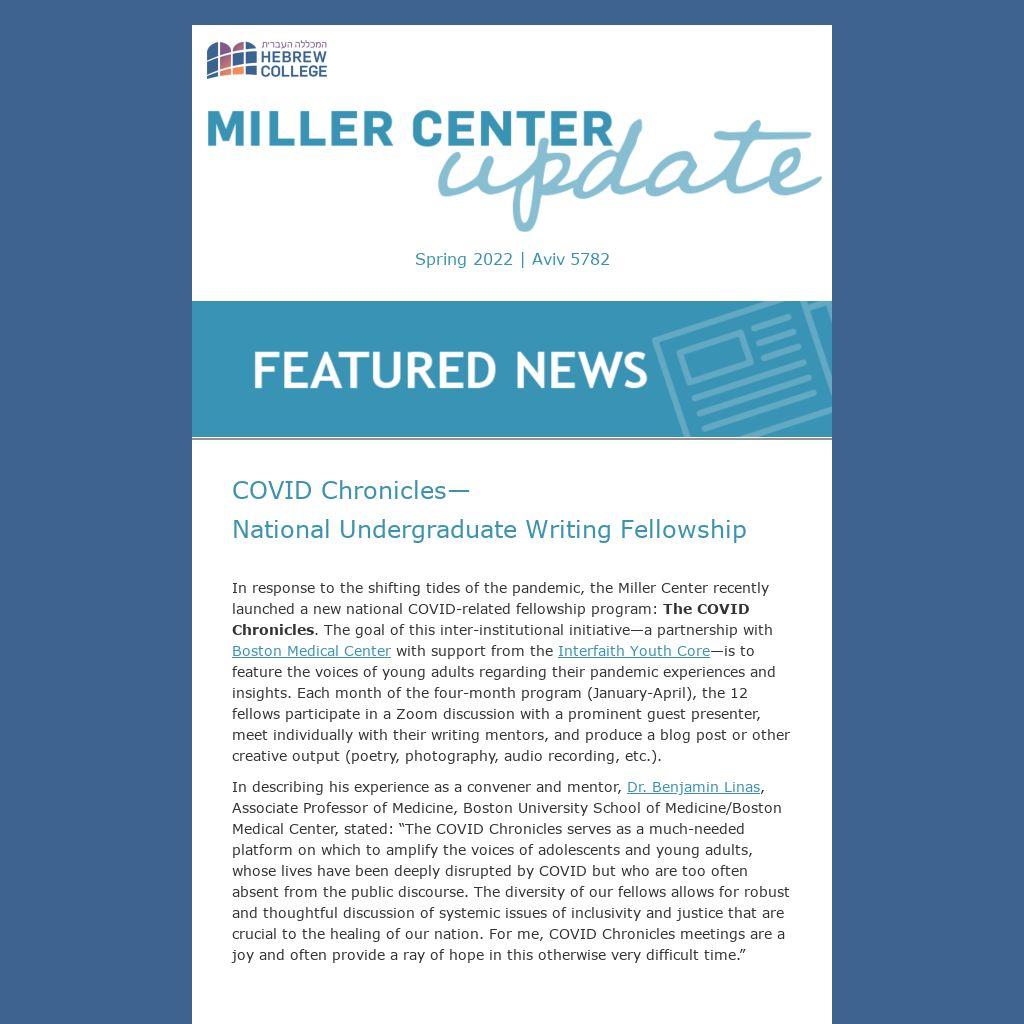In response to the shifting tides of the pandemic, the Miller Center recently launched a new national COVID-related fellowship program: The COVID Chronicles. The goal of this inter-institutional initiative—a partnership with Boston Medical Center with support from the Interfaith Youth Core—is to feature the voices of young adults regarding their pandemic experiences and insights. Each month of the four-month program (January-April), the 12 fellows participate in a Zoom discussion with a prominent guest presenter, meet individually with their writing mentors, and produce a blog post or other creative output (poetry, photography, audio recording, etc.).