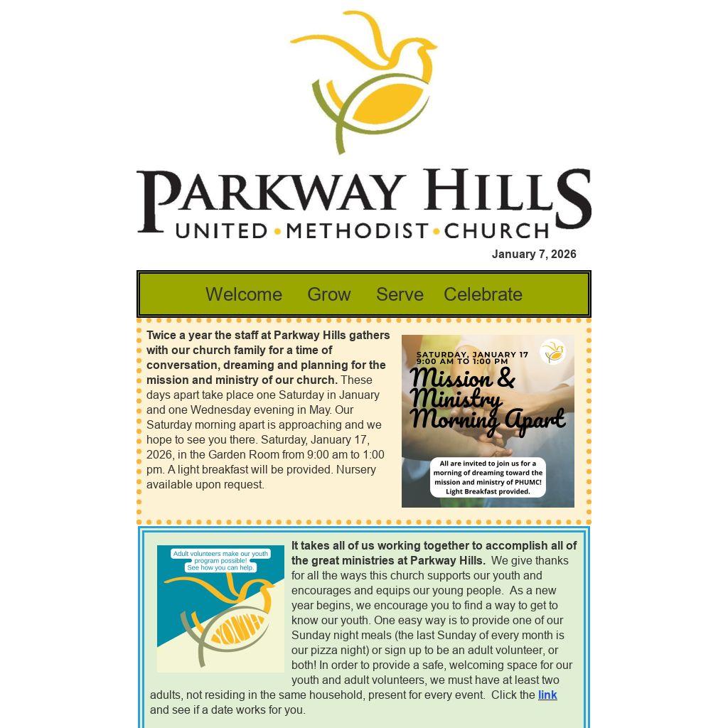 Twice a year the staff at Parkway Hills gathers with our church family for a time of conversation, dreaming and planning for the mission and ministry of our church. These days apart take place one Saturday in January and one Wednesday evening in May. Our Saturday morning apart is approaching and we hope to see you there. Saturday, January 17, 2026, in the Garden Room from 9:00 am to 1:00 pm. A light breakfast will be provided. Nursery available upon request.